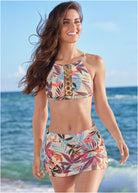 With a high neck and front cutout, this chic bikini top turns up the heat on any getaway. Glam metallic rings span the cutout for an extra eye-catching touch while the open back secures with an adjustable slider strap. The underbust band adds comfy support that lets you move.