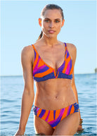 This scoop neck bikini top features a sleek, structured V-wire neck that contrasts with an artsy macrame under the bust. This style features both a back sash tie and adjustable shoulder straps for double-duty security.