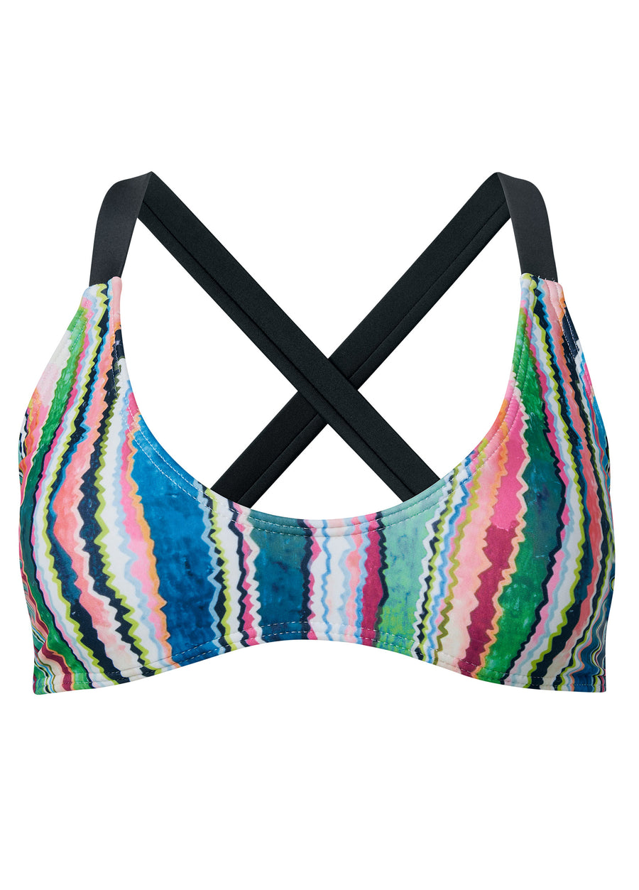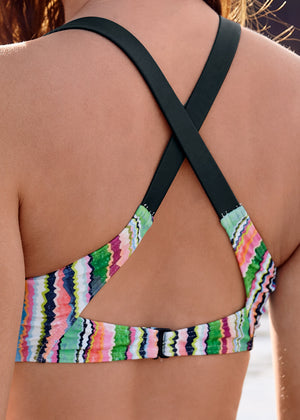 • This eye-catching top is your ticket to fun in the sun! In a vivid floral print, this sporty style features a low scoop neckline and strappy crisscross back. With a hook closure, you can get active in style without worrying about your suit coming untied.
