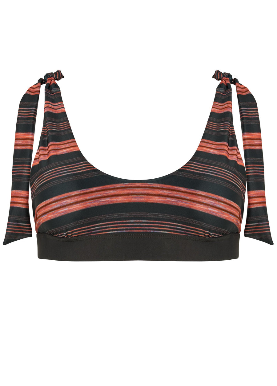 This scoop-neck bikini top serves up one fun and flirty look! From the vivid print to the playful shoulder ties, this suit is guaranteed to earn you compliments on your next beach day. The back band features an adjustable slide to help you achieve your perfect fit.