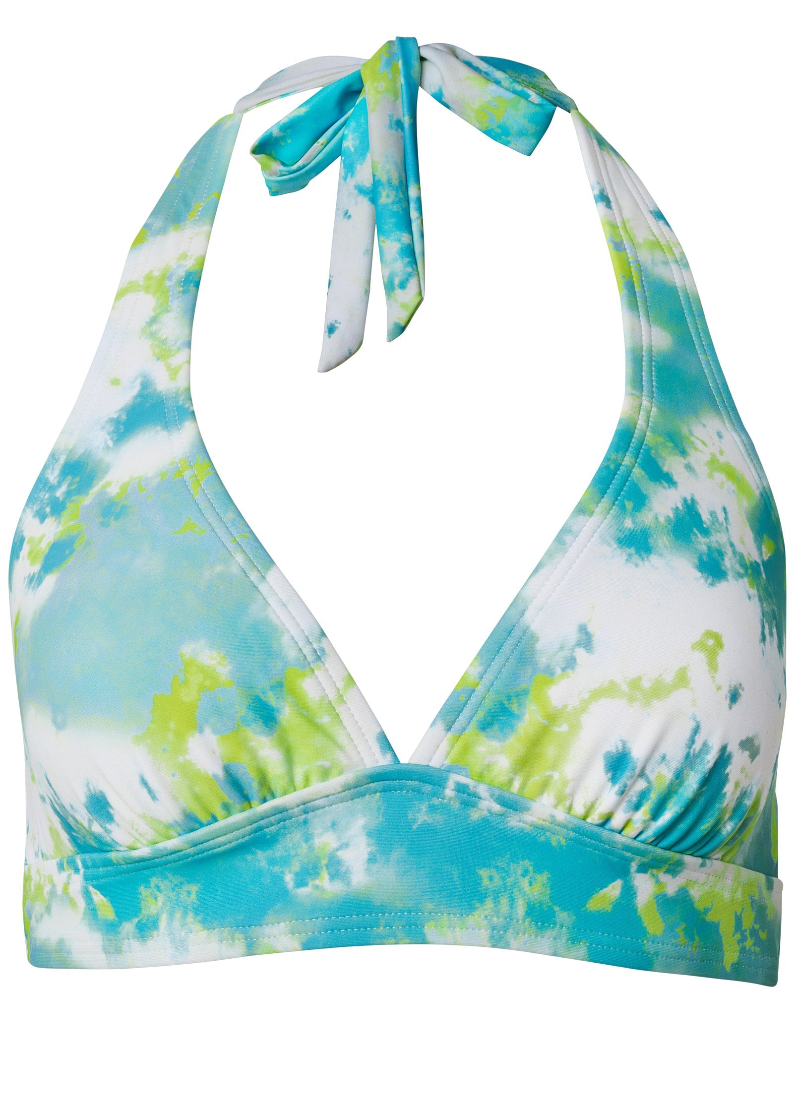 Feel (and look!) cool by the pool in a bikini top that radiates confidence. With the extra coverage from the underbust band and wide halter straps, you'll show off the curves you love without revealing too much. The optional extra shaping from the removable cups gives you the power to perfect your look! * Underbust band hugs you and helps support the bust * Ties behind the neck and back comfortably * For printed items; placement may vary * Removable shaping cups * Domestic or import of poly/spandex tricot