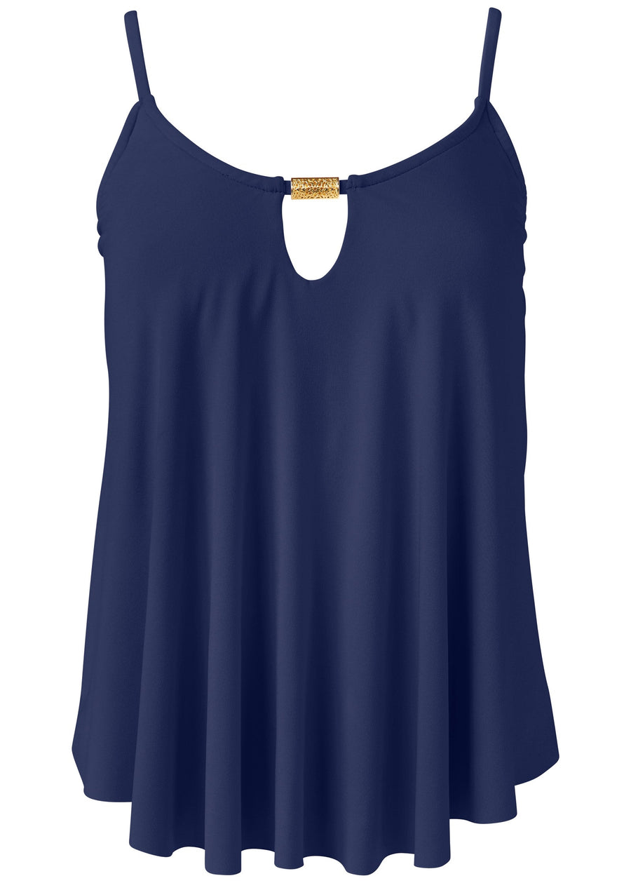 A center bust keyhole is fixed with a chic silver spiral, taking this classic, convertible scoop neck to new heights!