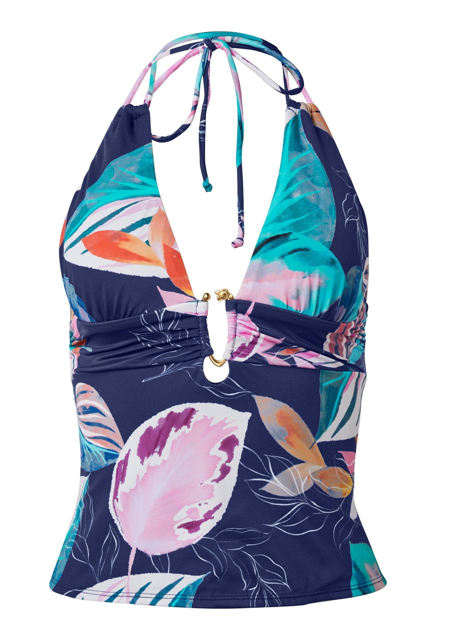 Coverage but with a sexy spin, this plunging tankini is ready to go to the beach! The deep front cutout gets a glam update with the fierce metallic detail looped through, finishing with a fitted under-bust band that flatters. Double narrow straps tie behind the neck for a secure all-day fit.