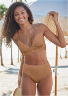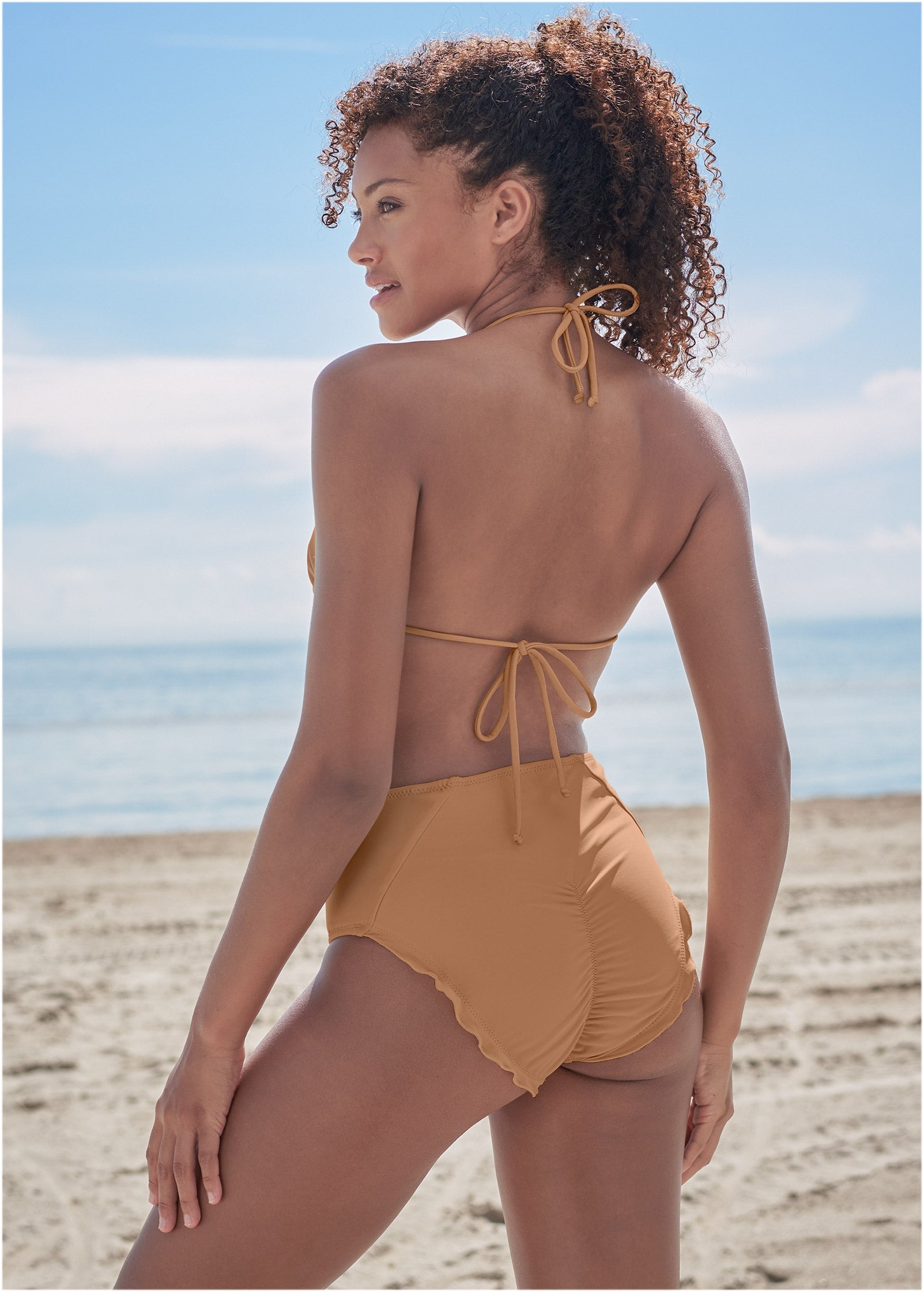 Much more than your average swim bottoms, this mid-rise pair features a center back seam that gathers the fabric in a flattering moderate-coverage cut. Flirty ruffles trim the back edges, adding an element of allure to this vacay must-have.