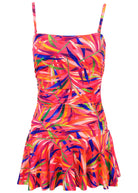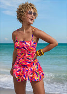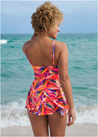 Go for a one-piece but with a little extra flirt! The bandeau-style neckline and twirly drop-waist skirted bottom of this swimsuit keep your beach-day look more modest, while ruching across the bodice gives your curves the spotlight they deserve. Busy family days have nothing on this chic swim piece!