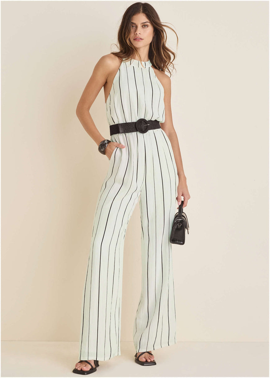 This striped jumpsuit is polished, but still ready to party -- perfect for taking you from desk to dinner with ease. The halter neckline adds a sleek touch, while the belted waist cinches you in just right. Whether you're powering through meetings or sipping cocktails at sunset, this one-piece wonder has you covered.