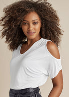 Comfort meets chic, trendy style in this cold-shoulder top that shows skin through the arm cutouts and V-neck. Blousy bodice and short, loose sleeves keep the fit relaxed before sitting at the hips in a more fitted hem. Or, opt to tuck this wardrobe basic in for endless outfit possibilities!