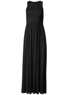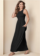 This comfy sleeveless maxi dress features a scoop neck, full back, and elastic empire waist. This full coverage long dress is an easy style to pull on all season long.