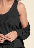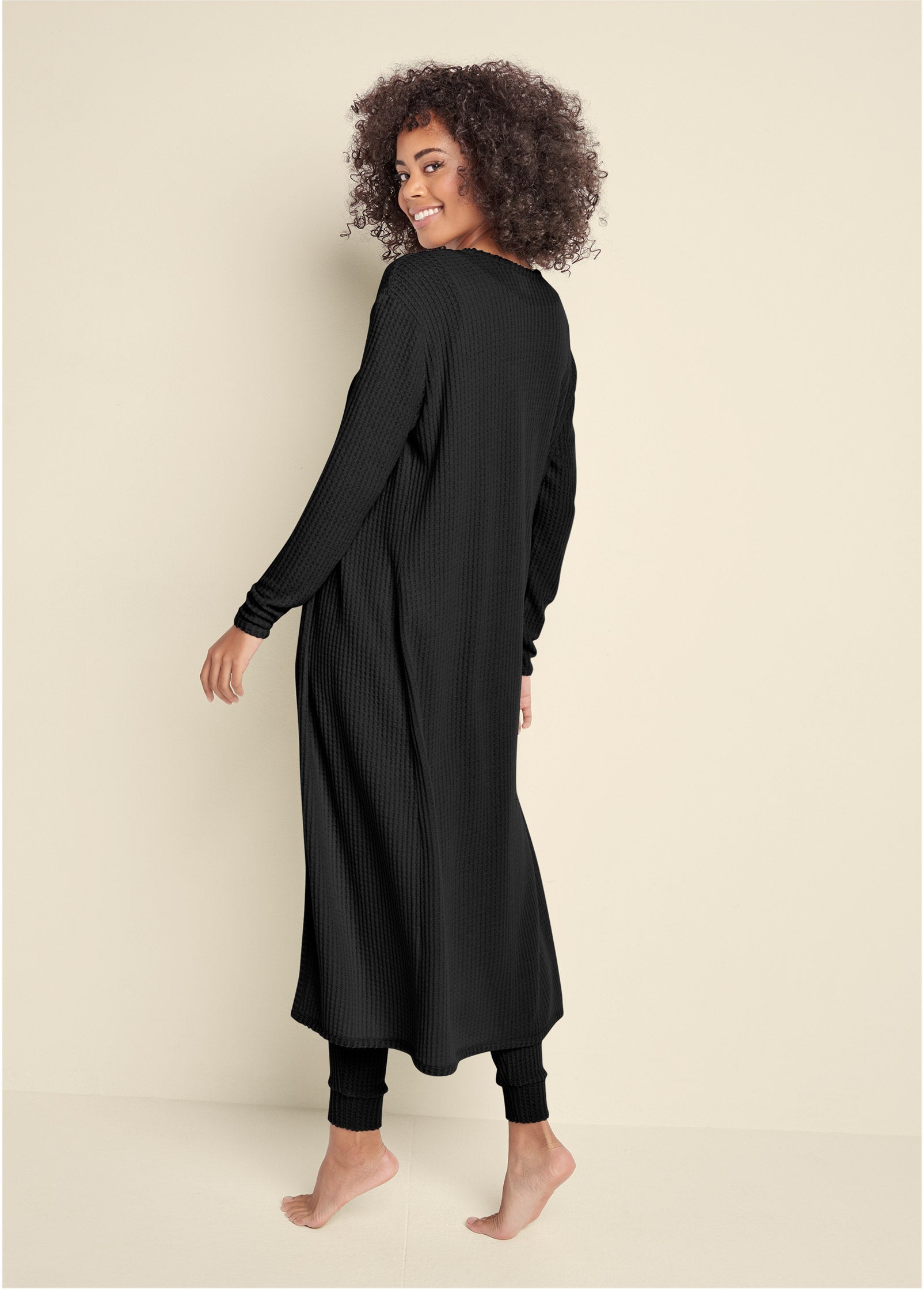 Snuggle up in this super-soft waffle knit lounge set that includes a duster, tank and joggers that tie at the waist for a perfect fit. Cozy enough to lounge on the couch all day, yet chic enough for your morning coffee run, be warned that you won't want to take it off. In fact, once you wear it you'll probably be tempted to buy it in more colors.
