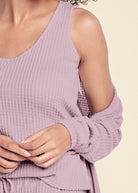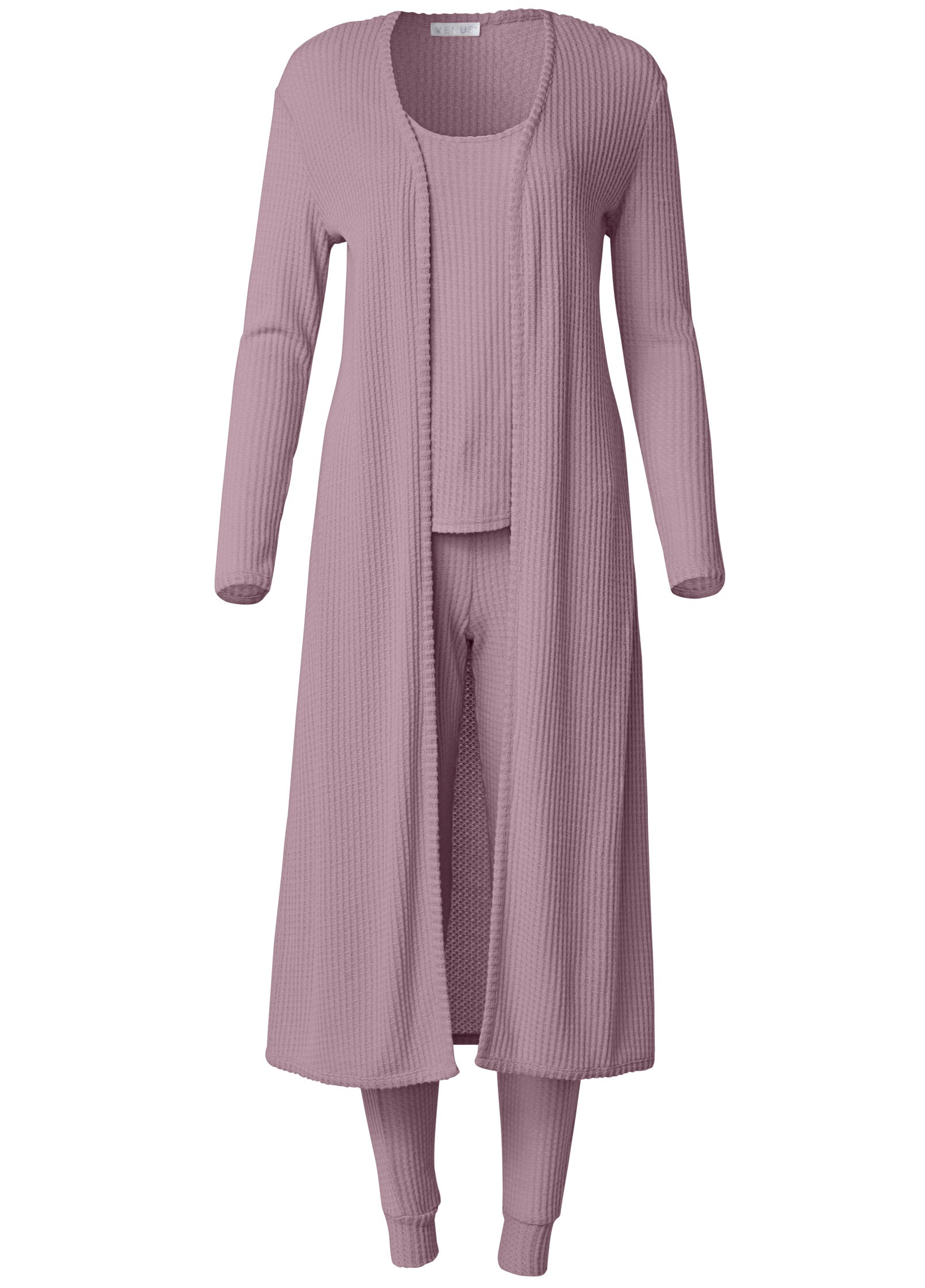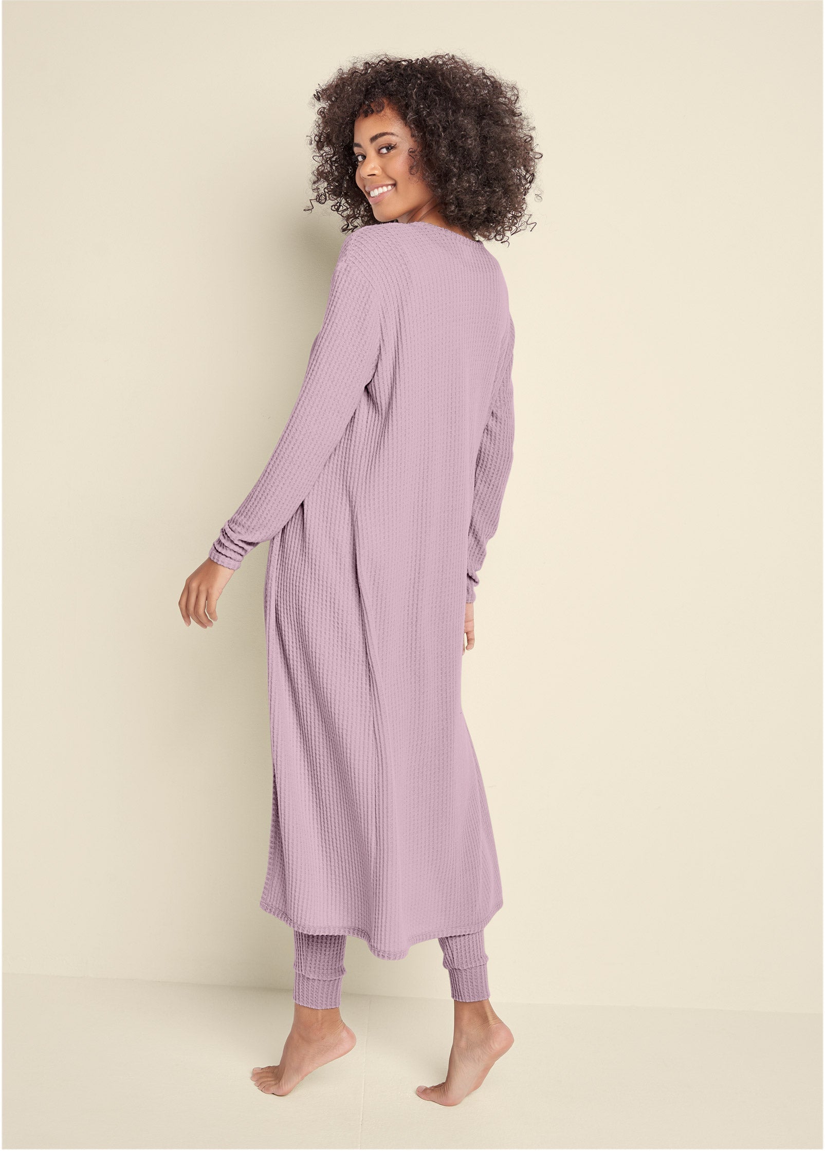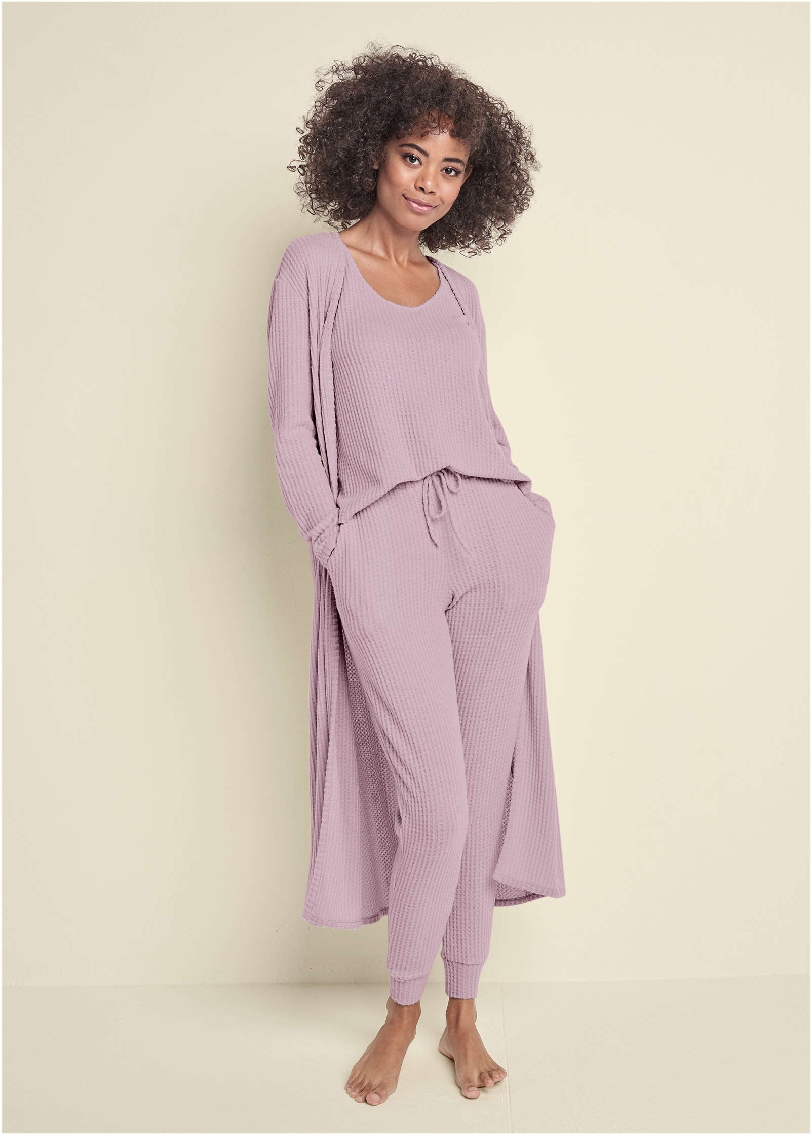 Snuggle up in this super-soft waffle knit lounge set that includes a duster, tank and joggers that tie at the waist for a perfect fit. Cozy enough to lounge on the couch all day, yet chic enough for your morning coffee run, be warned that you won't want to take it off. In fact, once you wear it you'll probably be tempted to buy it in more colors.