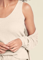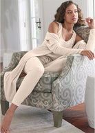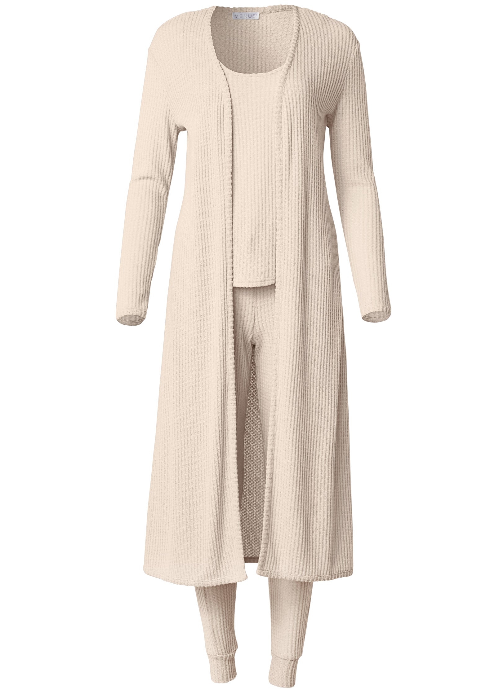 Snuggle up in this super-soft waffle knit lounge set that includes a duster, tank and joggers that tie at the waist for a perfect fit. Cozy enough to lounge on the couch all day, yet chic enough for your morning coffee run, be warned that you won't want to take it off. In fact, once you wear it you'll probably be tempted to buy it in more colors.