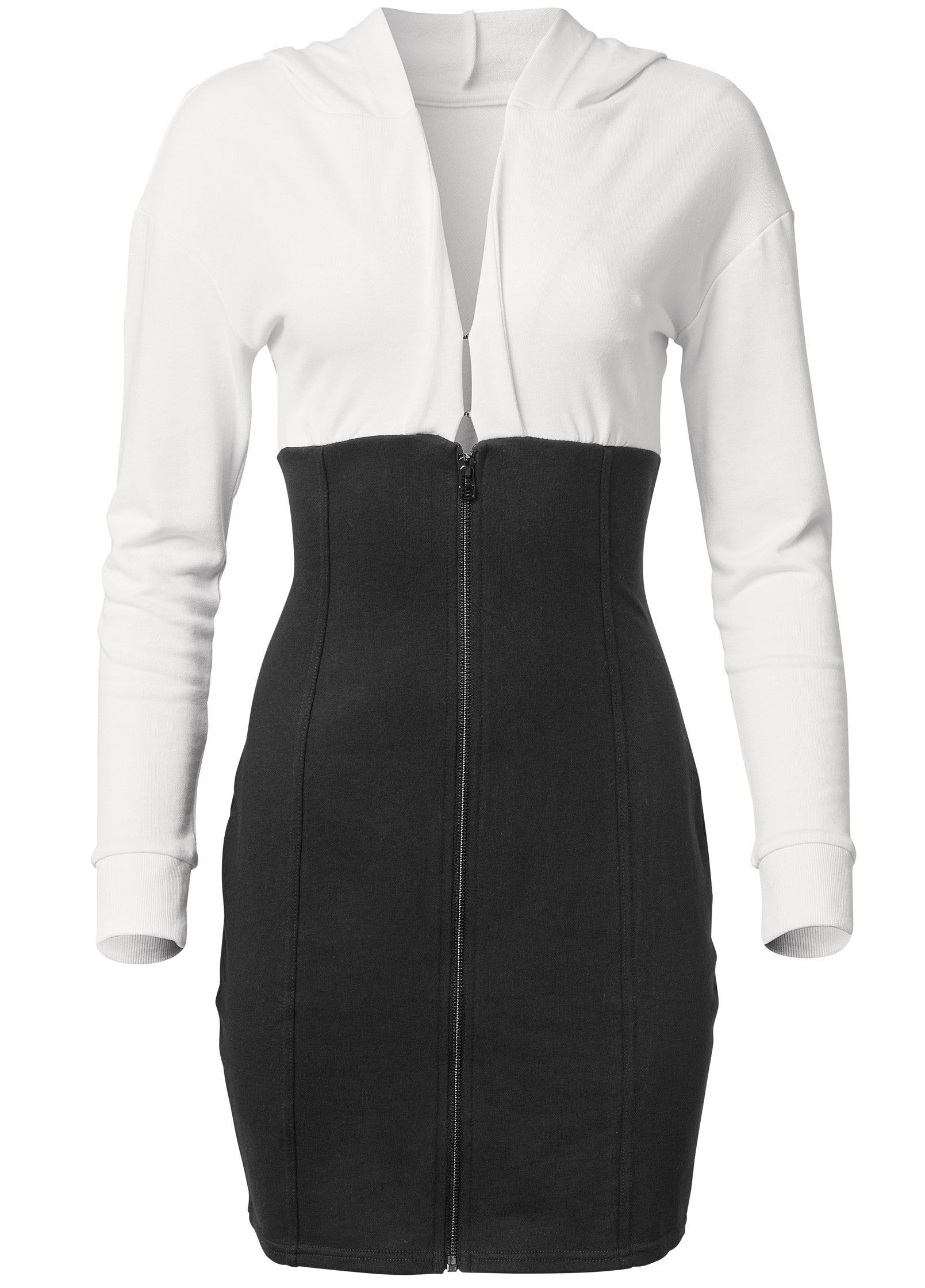 Transitioning between shades in a color block design, this corset dress appears to narrow with a hugged-in waist and allover fitted shape. Zipping from hem to V-neck, the front zipper adds edge and easy pull-on-and-go style. Made for lounging or for casual hangs, this long sleeve dress moves with you.