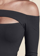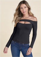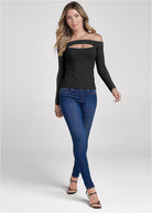 If you're looking for versatility, this top delivers! Easy off-the-shoulder styling combines with a wide front cutout along the neckline to add sexy appeal to this effortless long sleeve. Fitted enough to be tucked or left loose over denim, this go-with-anything piece is a wardrobe must-have.