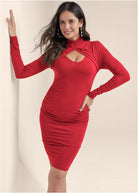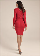The contoured wrapped mock neck and all over bodycon fit of this long-sleeve midi dress reveal your edgier side. Boasting cutouts at the neckline and back that reveal peeks of skin, this winning dress uses ruching across the hips for extra smoothness. Layer with a jacket or cardigan for a more casual spin.