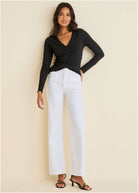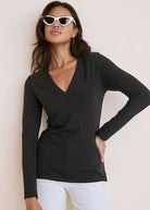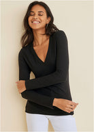 Your quest for the perfect long-sleeve top stops here. This winner is done in fine ribbed fabric with plenty of stretch. Translation: it's super comfy and hugs in all the right places. Tuck this wardrobe essential into jeans, skirts, trousers—you name it. It's casual yet elevated and always looks like a 10/10. * Sizes: S (4-6), M (8-10), L (12-14), XL (16) * Plus sizes: 1X (18-20), 2X (22-24), 3X (26-28) * 25.5" from shoulder * Deep V-neck * Long sleeves * Polyester/viscose/elastane. Imported