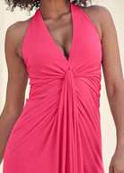 Allover graceful folds and draping flatter your shape while sash ties at the halter neck and center front allow for a custom fit. The hanky hem on this maxi dress matches to the deep V neck and stays true to the flowy feel. Pull on this stunner and make an entrance at your next event.* Sizes: XS (2), S (4-6), M (8-10), L (12-14), XL (16)* Plus sizes: 1X (18-20), 2X (22-24), 3X (26-28)* Sleeveless* Plunging V-neck* Knot front detail* Halter tie closure* Handkerchief hem* 59" approx. length; varies by size * Does It All Jersey (Poly/viscose/elastane. Imported)