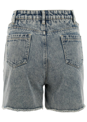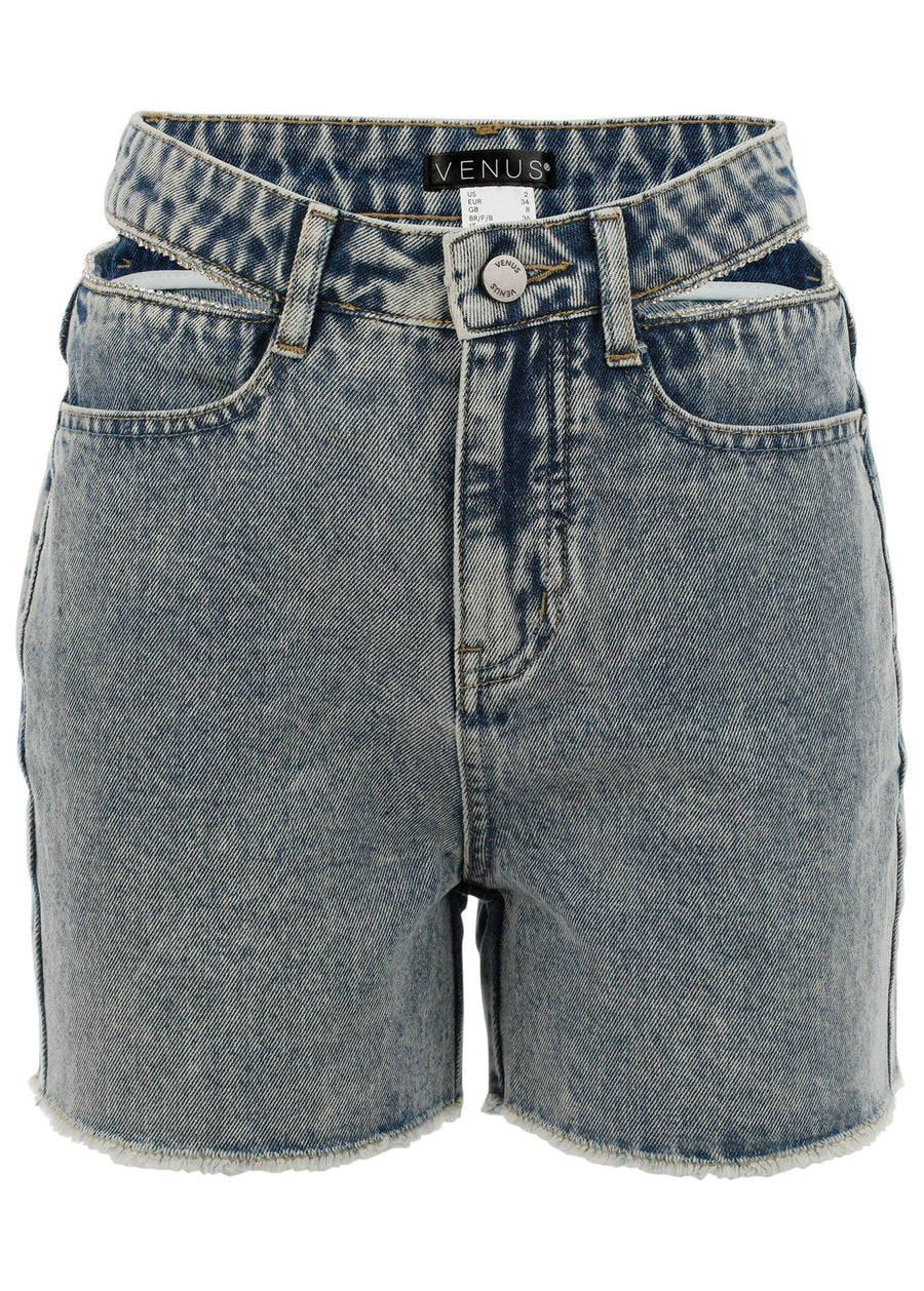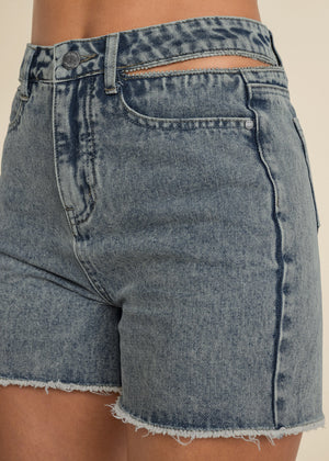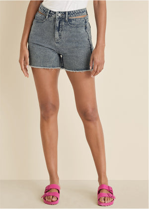 Glam denim shorts are a thing and you're looking at them. Peek-a-boo cutouts at each hip are embellished with sparkling rhinestone trim. Pair these cutoffs with a top that just kisses the waistband or try a front tuck to make sure the notice-me details get their deserved air time.