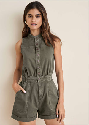 Utility has never looked as chic as it does in this twill romper. We paid extra-special attention to the fit so that the functional details don't overpower the feminine elements, like a figure-flattering defined waistband. Cuffed hems on the shorts add a polished twist so you can absolutely dress this piece up with heeled sandals.