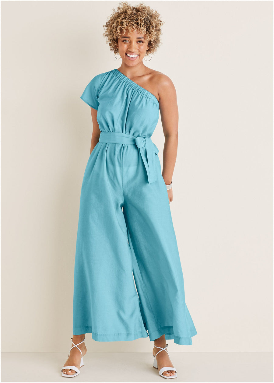When the occasion calls for dressing up, but the forecast calls for soaring temps, this one-shoulder jumpsuit is what you'll want to wear. Its wide-leg fit and lightweight fabric look and feel breezy so you'll be comfortable all day long. Cinch your waist with the flattering tie belt for a polished finishing touch.