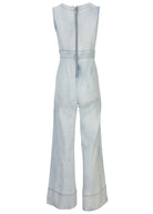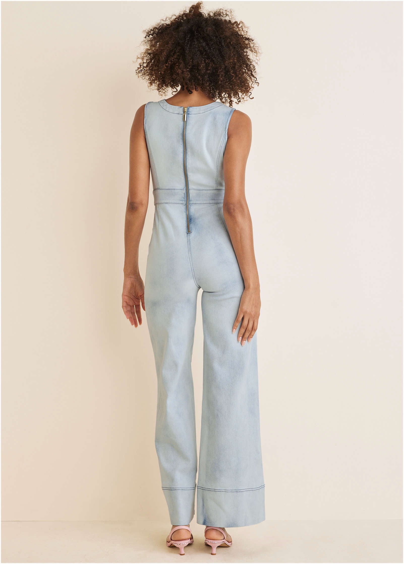This stretch denim jumpsuit is a party of one. With a dramatic plunging neckline and statement wide legs, the streamlined silhouette is ultra-flattering and can easily be elevated for evening. Just add heels plus bold jewelry and you've got your new date-night or girls'-night-out look.