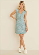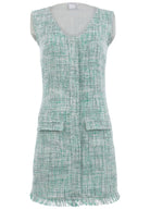 Polished tweed goes playful in this fringe-trimmed shift dress. With a flattering scoop neckline and mini length that highlights your legs, you'll feel 100% fresh and feminine in this little number. Add heels for spring occasions or loosen up the look with white sneakers. * Item runs large; size down for a better fit * Sleeveless * Faux front pockets * Back zipper closure * Fringe trim * Mini length: 34.5" from shoulder * Polyester. Imported