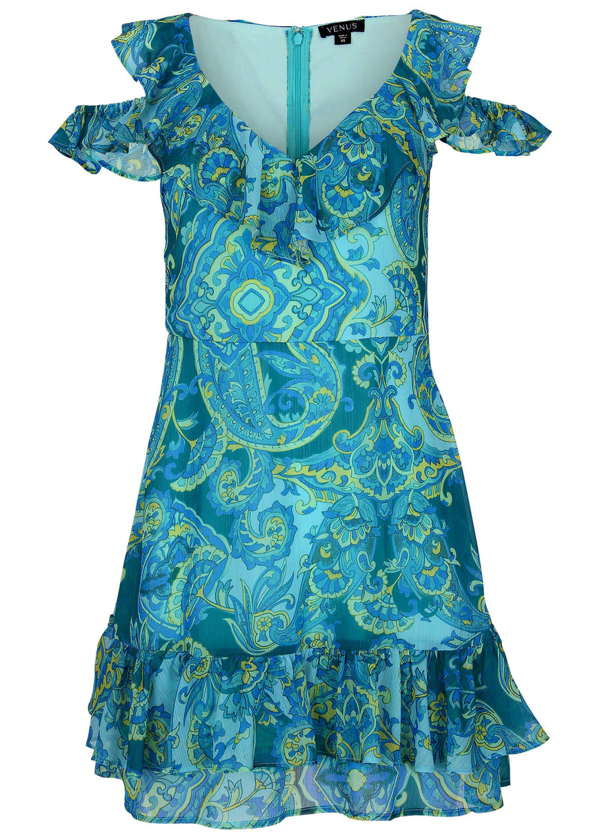 In this mini dress, you'll look pretty in paisley all season long. With a V-neckline and cold shoulder design, it lets you show just the right amount of skin. The ruffle detail on the sleeves and hems adds playful movement, while the fully lined design ensures comfort. Whether you're heading to brunch or a casual day out, this dress is sure to turn heads.